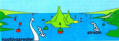 Merk op dat de scheidingston onder het eiland dezelfde kleuren heeft als de scheidingston boven het eiland. Dat komt omdat je steeds moet redeneren vanuit de betonningsrichting. En ten opzichte van de betonningsrichting ligt voor beide tonnen het hoofdvaarwater rechts.