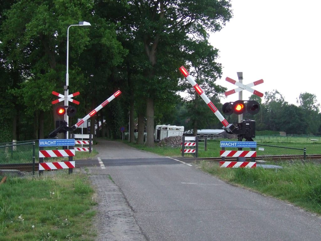 Heeft Automatische Halve OverwegBomen, rode knipperlichten en belgeluid bij nadering van een trein. | Zodra de rode lampen knipperen of de bellen rinkelen, moet je stoppen. Wacht tot de lampen uit zijn, ook als de bomen al omhoog zijn. |